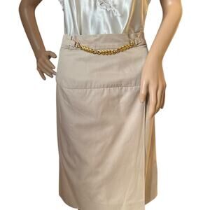 Beautiful Celine Paris khaki pencil skirt with with gold front faux chain link Embellishment. Back zipper and button closing and fully lied