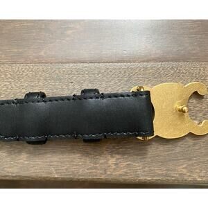 Elevate your wardrobe with this stunning Celine Paris Triomphe Belt. Crafted with the finest black leather from Italy, this medium-sized belt features a solid pattern with a buckle and logo accent. The adjustable belt is designed for women with a waist size of 31-33 inches.