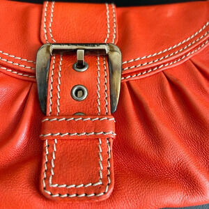 Rare ava baguette bag from the Celine brand, baguette model worn on the shoulder, very beautiful orange color with beige stitching detail, short leather shoulder strap, silver-colored buckle on the front with loving pressure, very good condition, very light marks in the back. Super clean interior except one small black dot. Silver buckle and interior zipper have color change. small compartment with zip in the pocket.