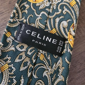 In pristine condition, 100% silk Celine tie. Gorgeous colors, of green, gold and beige. Rope details intertwined with iconic Celine gold ring.