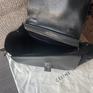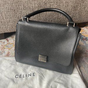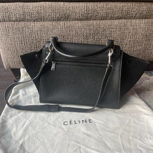 The Trapeze features a leather and suede body, an exterior back zip pocket, a rolled top handle, a detachable strap, a front flap with clasp closure, a top zip closure, and interior slip pockets. 8.7" L x 11" W x 5.3" D, 3.5" drop.