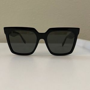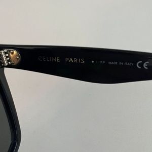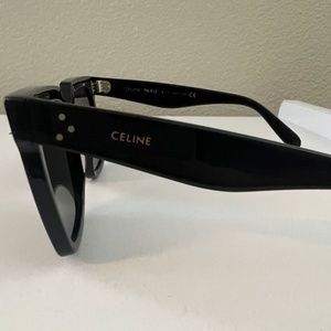 Black oversized sunglasses by Celine with cleaning cloth and case. Original price $500. Barely worn, cleaning cloth never used. Small indent on the inside of the frame, above the nose. Cannot be seen when wearing the glasses, only upon visual inspection. Purchased the glasses from Nordstrom with the indent already there. No other damages or scratches.