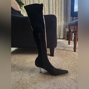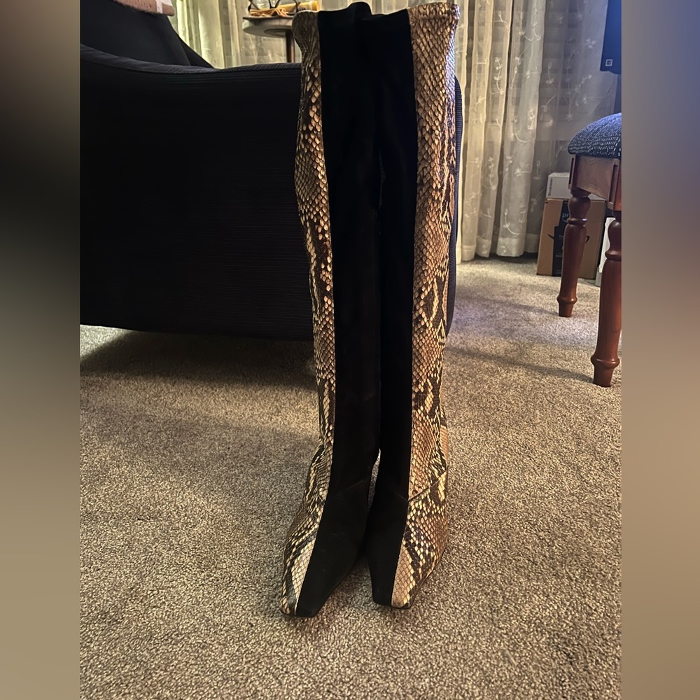 Knee-high boots with pointed toe and slim stiletto heel. Python leather mixed with black suede. Slight stretch with invisible half zipper at side. 37.5 Euro/7.5 US. 3” heel. 20” from heel to top of boot.