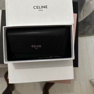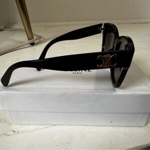 Experience timeless elegance with Celine's black cat-eye sunglasses, featuring a glossy finish and gradient lenses. These high-fashion accessories are designed to make a statement, showcasing the iconic Celine branding on the temples. Perfect for adding a touch of sophistication to any outfit.