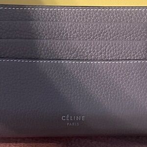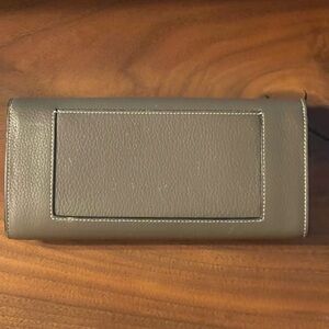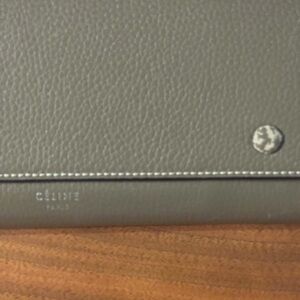 Chic Celine clutch in taupe leather. Features minimalist button accents.