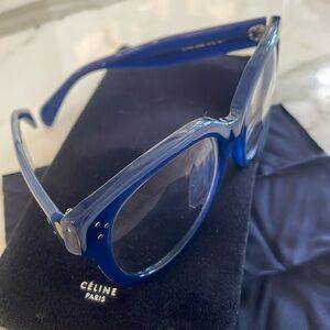 Celine Translucent Blue Frames Glasses—Frame Only—GORGEOUS!! Made Italy—Like New condition. Comes with padded case holder and cleaning cloth. White spots in photos are light reflection. Not flaws. These are new!!