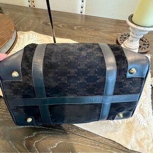 Vintage Celine Suede Boston Bag in Navy Blue features a zip closure and a top handle bag style, with a beautiful blue leather handle/strap and gold hardware color. The bag is made of high-quality leather and suede exterior material, with a blue lining. Made in Italy