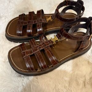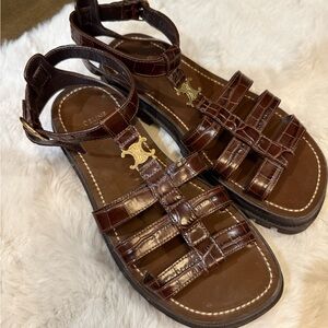 Elegant Celine sandals in dark brown. Features gold emblem detail. Ideal for stylish outings. In great condition, only wore these twice!