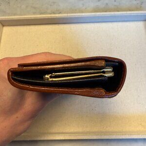 Callouts: The exterior leather has light, minimal scratching, while the interior shows slight impressions from the gold clasp hardware.