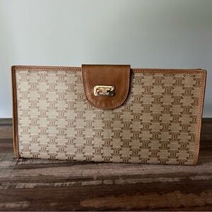 Stylish CELINE wallet featuring a brown and tan Triomphe monogram design. Elegant logo clasp detail.