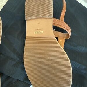Celine sandals feature a minimalist T-strap design in luxurious brown leather with elegant gold accents. The sandals offer a comfortable flat sole and a secure slingback ankle strap, making them perfect for versatile summer wear.