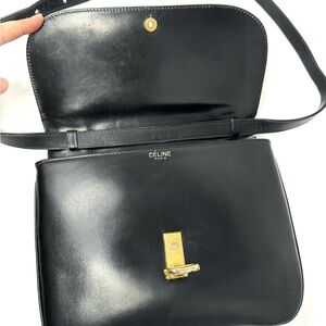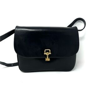 Rare vintage Celine crossbody bag featuring the iconic gold horse carriage clasp and smooth black leather. A true collector’s piece from the minimalist era of Céline. Gold hardware is naturally aged and leather has some light surface wear, giving it vintage character.