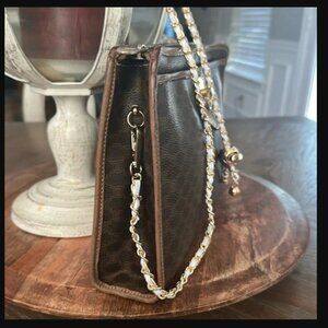 This is a lovely set of Celine Vintage Macadam clutch crossbody and Leather bifold wallet in great used condition. The Celine clutch has D rings added to either sides and an unbranded adjustable shoulder chain so you can carry her crossbody style! This is good vibes vintage Celine.