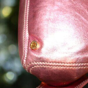 Celine Top Handle Bag, originally designed by Michael Kors, is an extremely unique vintage Celine bag. It is crafted from soft metallic pink leather and features gold tone hardware. It has rolled handles, four exterior pockets, suede interior lining with two dual interior pockets, a zip closure on the front, snap closure on the side and open top, and protective feet at the based. Moderate discoloration at interior; minor mark at back; minor scratches at hardware.