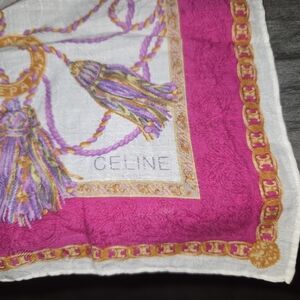 Chic Celine scarf with vibrant tassel design. Features pink and purple accents on a white base. Perfect for a stylish touch.