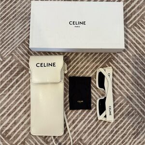 CELINE’s modern flat-top frames feature a rectangular shape with a logo detail at the temple and a glossy finish. Includes matching case and box.