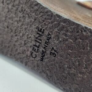 These Celine wooden wedges deliver a chic 1970s-inspired silhouette crafted from premium Italian leather. Rich tan straps and signature gold hardware complement the sculpted wooden platform. Perfect for summer dresses, denim, and elevated everyday outfits with designer appeal.