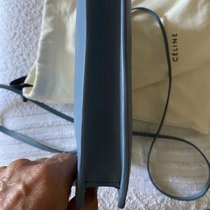 Celine mini clasp bag. Silver tone hardware. Leather lining with card slots. Push lock closure at top. Beautiful medium blue color. Phoebe Philo designed. Comes with dust bag. Excellent condition - like new.