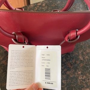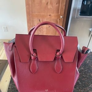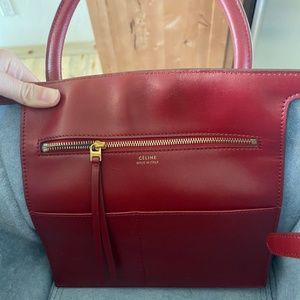Celine burgundy leather knot bag in good condition with a few minor scratches that can be buffed out. Barely used - maybe 5 times. The bag features rolled leather top handles with sides that may be tucked in or expanded with a snap, and a cross-over flap that fits securely around the knotted handle bases. It opens to a light blue suede interior with a leather hanging zipper and patch pocket panel. Very clean on the inside and includes tags for authenticity. Beautiful bag and hate to part with it.