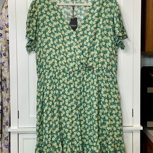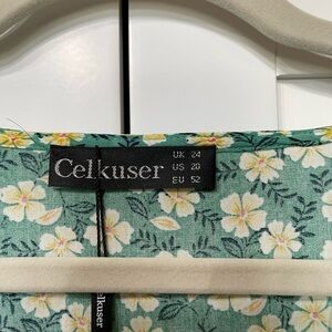 Charming Celkuser dress with a floral design. Features teal and yellow tones. Ideal for any event.