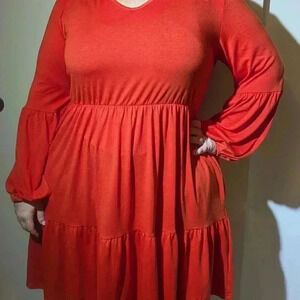 Celkuser Plus Size Long Lantern Sleeves Loose V-Neck Babydoll Dress with Pockets