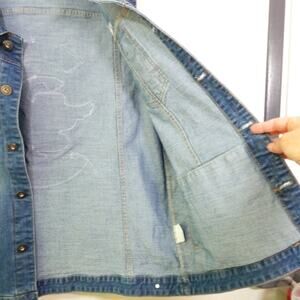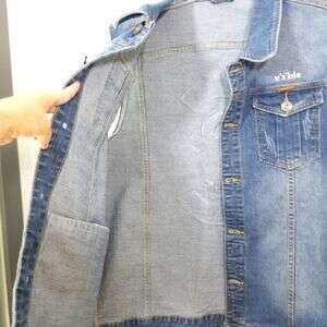 Cells Angels jean jacket denim vest is a play on Hells Angels motorcycle club for the cell phone hooked. Large patch back and embroidered. Can't make out the brand on the leather strip on front. It's Eagle???? Jeans.