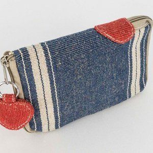 Showroom sample in new condition, hand loomed jute cotton cell phone holder with zipper closure as shown, cotton lined, cute jute cotton heart attachment, from our overseas program which we sponsor for indigent women living in poverty in India, made entirely by women by hand, done on traditional looms, the purchase of this bag makes a real difference in someone's life! Indigent in India need our support now more than ever.