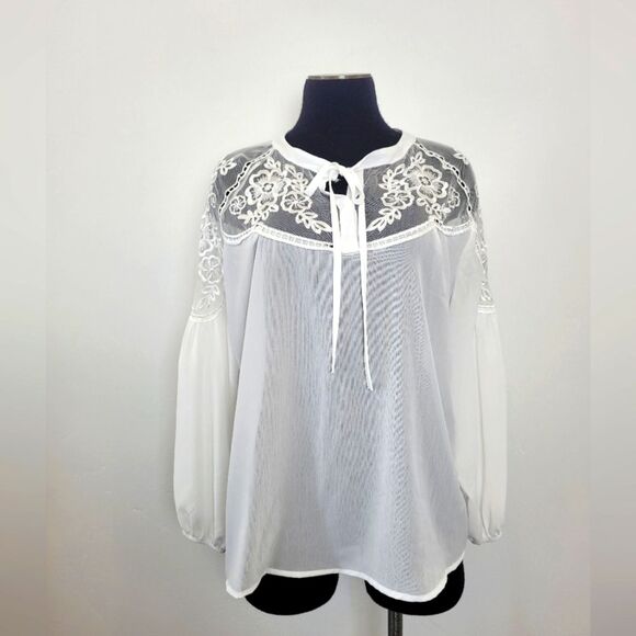 Stunning sheer white blouse with floral lace panels on the puffed sleeves and a tie at the collar. Flowy, ethereal, dainty. Excellent condition. Size large, measures approximately 26 inches long 21 inches underarm to underarm laid flat.