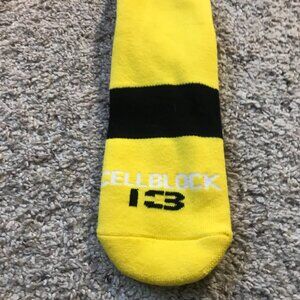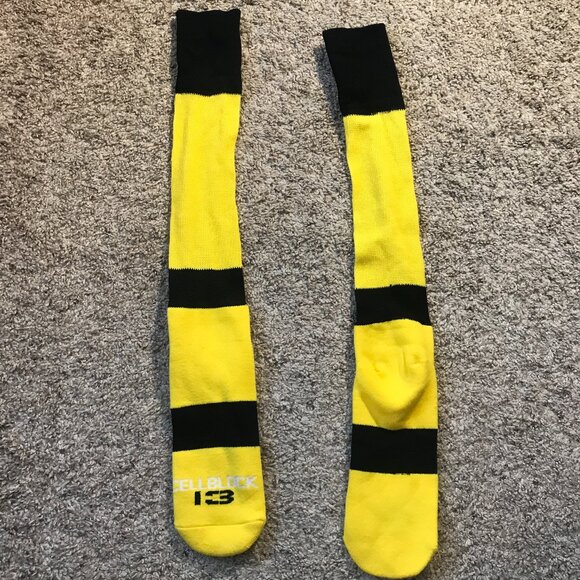 Great set of socks from Cellblock 13. Still new and unworn right now. Black/yellow and knee length. Quite sexy,