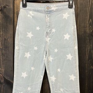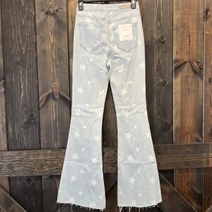 New with tags. Cello brand jeans. Size 3. High Rise Skinny Flared style. High waist / High waisted. Super stretch denim. All over graphic print STAR. Light wash. Raw hem.