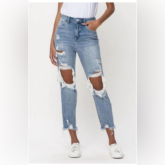 Cello High Rise Straight Leg Destroyed Ankle Length Jeans With Distressed Hem