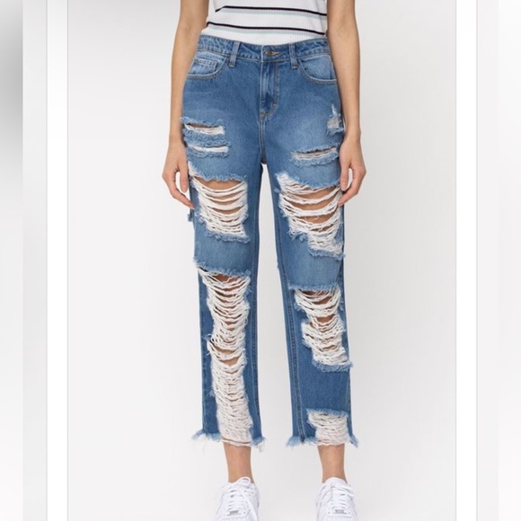 Description: Even on your most casual days, add a pop chick style with the High Rise All Over Distress Straight jeans! These light wash jeans bring an edgy vibe with the destructed style, while providing comfort with its high rise fit.