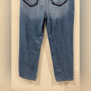 High rise, 100% cotton, button fly, dad jeans, wide leg, mid blue wash, patchwork style back pockets, light distressing, country, western, coastal cowgirl, boho, contemporary