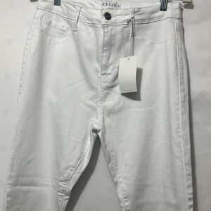 These Cello jeans feature a crisp white color and a chic cropped ankle length, complete with a stylish frayed hem. Designed for a high-waisted fit, they offer a sleek and modern look perfect for casual outings.
