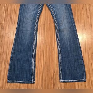 These stylish blue jeans offer a timeless look for any wardrobe. Perfect for casual outings or dressing up, they provide comfort and versatility. Missing 2 grommets. Still soft and stretchy.