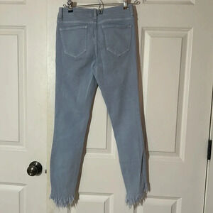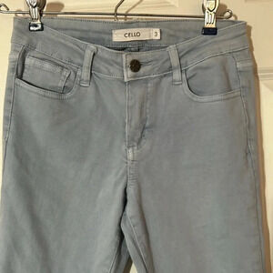 These are cello light denim jeans in a size 3. They’re 55% cotton 43% rayon 2% spandex. Machine wash warm on tumble dry low.
