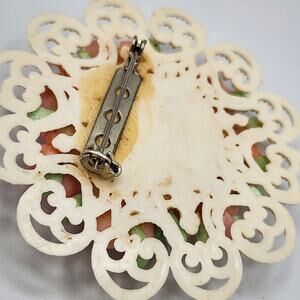 Celluloid Filigree Brooch w Pink Sea Shell Roses c. 1930s over 2" Spring Flowers