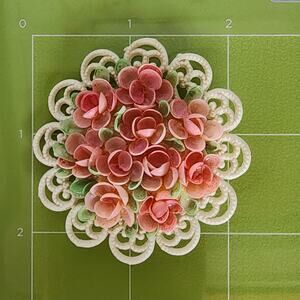A bouquet of delicate pink roses made entirely of pink dyed real shells on a celluloid base that almost looks like a lace doily. The green leaves are also made of shell. Size is just over 2 inches in diameter. Condition is very good. Pin back may be a replacement, please see photo.