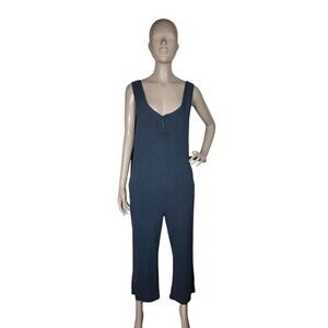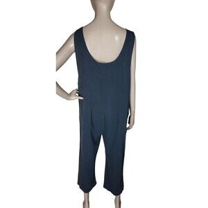 The Celmia Collection sleeveless frog closure low-cut wide leg cropped jumpsuit in faded blue/grey tone, pockets, s ize large is a stylish and comfortable one-piece outfit perfect for casual occasions. The solid blue color and scoop neckline add a touch of elegance, while the wide-leg design and cropped style give it a trendy edge. Made from machine washable fabric, it is easy to care for and suitable for wearing during the summer and spring seasons. The frog closure adds a unique and playful detail to this fashionable jumpsuit from the Celmia Collection.