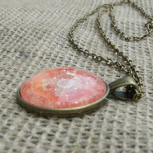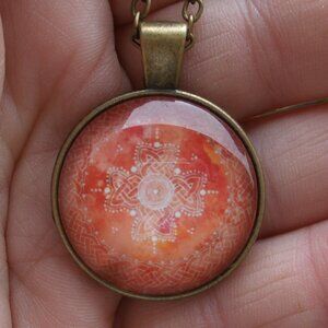 Celtic knotwork glass cabochon necklace. Bronze color metal. Clear glass cabochon over picture. Design is a 4 direction knot with knotwork around the outside. Pendant is 1 inch in diameter, and 1 3/8 inches high with bail. It's on an 19 inch long chain. Textured design on backside. Brand new item from my local shop. For women or men. Great for anyone who likes Celtic knotwork jewelry.