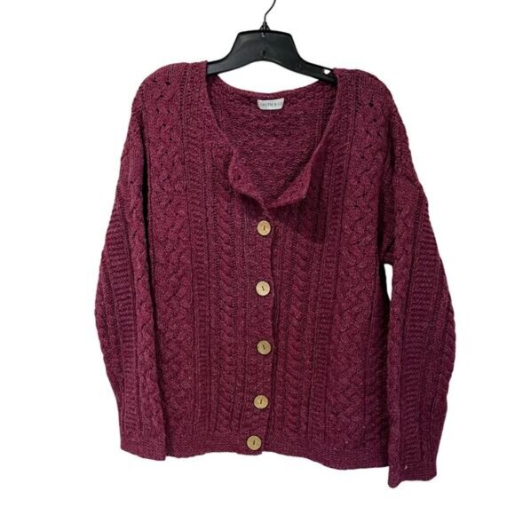 Celtic & Co. 100% Pure New Wool cardigan sweater in a deep plum tone. Features cable knit texture, wood-look buttons, and a cozy relaxed fit. Handcrafted quality from the UK.
