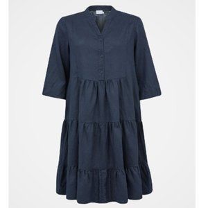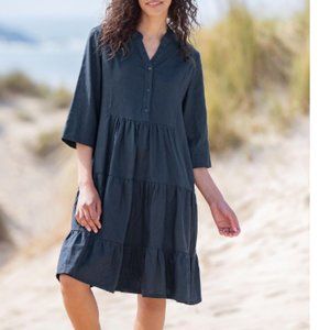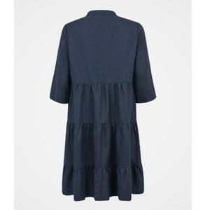 This Knee Length Swing Dress is made from 100% linen and features gathering into tiered seams, giving the dress lots of volume. This dress has also been garment washed to give it a softer tumbled finish, making it a perfect summer essential which is easy to dress up or down. The upper section of the dress has a small stand collar and a button through half placket detail on the front yoke.