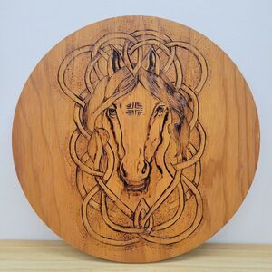 This beautiful handcrafted wood art plaque features an intricately detailed horse head surrounded by flowing Celtic knotwork. The design is hand-burned into a solid wood base using pyrography, giving it depth and a rustic, earthy character.