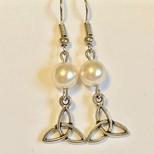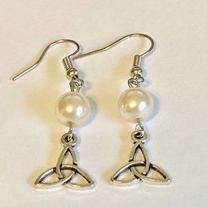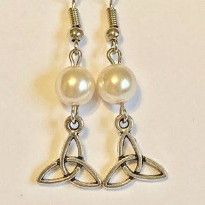 Celtic Knot Earrings Silver Plated Irish St Patricks Day White Glass Pearl
