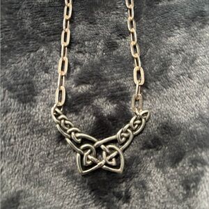 Beautiful silver-tone necklace featuring a bold Celtic-inspired knot pendant on a chunky chain. A unique and eye-catching design that works perfectly as a statement piece or for layering with other necklaces.
