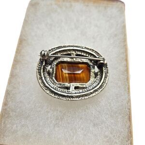 Silver tone metal filigree with Celtic Style Knotwork Boarder, yellow agate stone, light patina due to age.