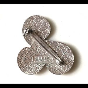 Shiny silver triskelion Celtic design pin with three swirls highlighted in black. Center triangle has a pink cast to it that doesn’t show up well in photo.