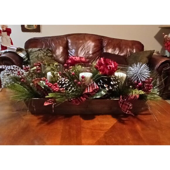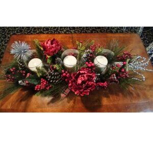 This centerpiece is handcrafted by BJ Florals. It is incased in wood and adorned with three beautiful candles. This can be used to spruce up your Holiday Seasons or a year round.