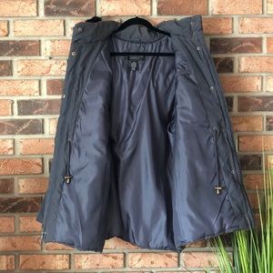 Faux fur lined removable hooded coat. Nice and warm. Zipper and snap button front closure. Shell:88% polyester 12% nylon. Lining/Padding: 100% polyester. Faux Fur: 85% acrylic 15% polyester