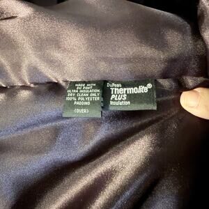 Women’s size Large. 100% leather long coat in plum purple. Button front, two pockets, back slit, and removable Thermolite insulated liner. Fully lined. Great quality and style!